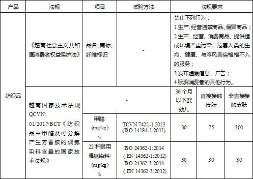 越南纺织服装技术法规为QCVN: 01/2017/BCT《纺织品中甲醛及可分解产生芳香胺的偶氮染料含量的国家技术法规》(法规颁布21/2017/TT-BCT⑪及后续修订07/2018/TT-BCT⑫、20/2018/TT-BCT⑬)。