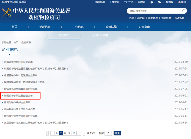 可在“动植物检疫司”的“企业信息”栏目中打开 “马来西亚输华水果企业名单”中的“2021年度马来西亚冷冻榴莲输华注册企业名单(2021年8月20日更新)”查询输华“冷冻带壳榴莲”和冷冻榴莲果肉“的注册企业,也可复制以下链接到浏览器打开查询:http://dzs.customs.gov.cn/dzs/2747042/2753729index.html
